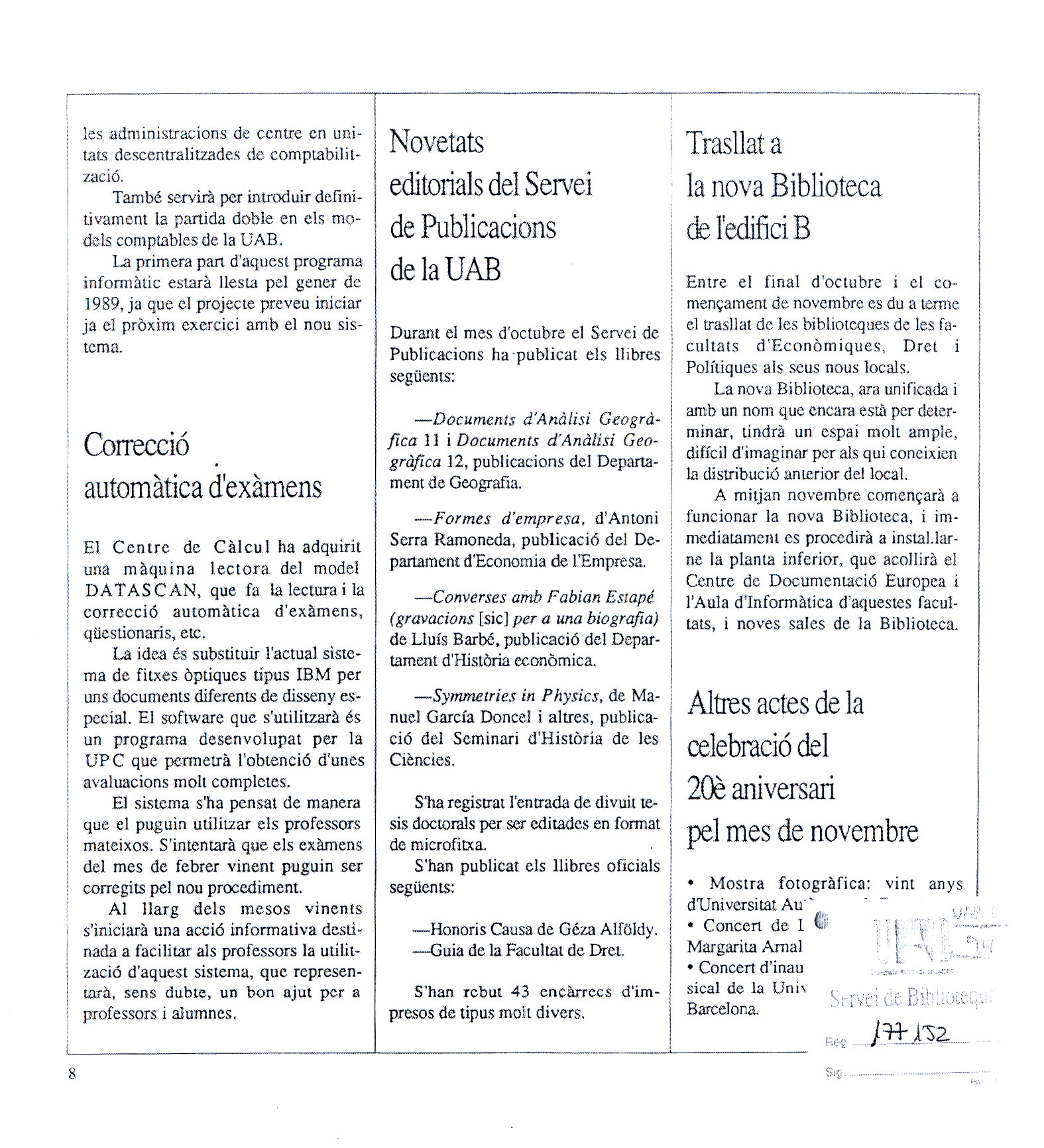 Les biblioteques de la UAB estrenen el nou sistema automatitzat Millennium per a les gestions de préstec, revistes, adquisicions i consulta del catàleg. Es poden reservar llibres prestats dels del catàleg i rebre avisos per correu-e.