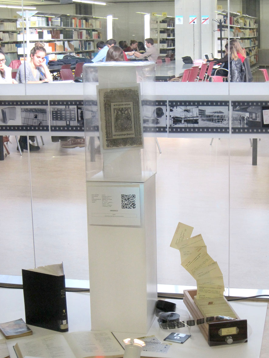 L'exposició presencial reconstrueix d'una forma al·legòrica el punt d'inflexió en que es troben els serveis bibliotecaris: entre la biblioteca basada en el paper, i la nova biblioteca electrònica o digital. A l'exterior de la biblioteca, una pintura digitalitzada de gran format ens presenta dues figures humanes que observen respectivament el passat i un present que mira cap el futur. A l'interior, es mostra el cartell commemoratiu de l'esdeveniment que es projecta en un espai ple de referències a la història de la biblioteca. A cada flanc i en dues columnes es mostren els documents, les eines i els instruments bibliogràfics, d'un document del segle XVI i d'un document electrònic d'accés amb codi QR datat el 2013.